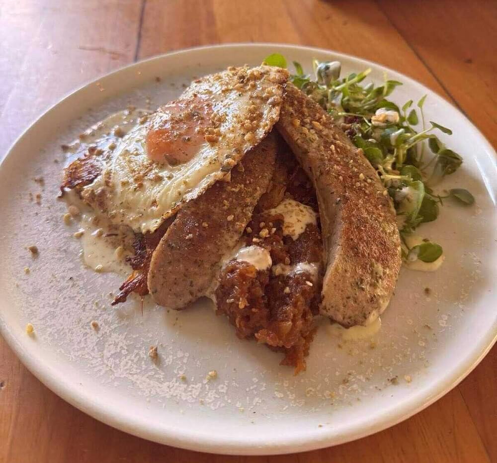 pork & fennel sausage, potato & leek fritter, fried egg, watercress, dukkah spice, apple & mustard relish, herb crème fraîche gf