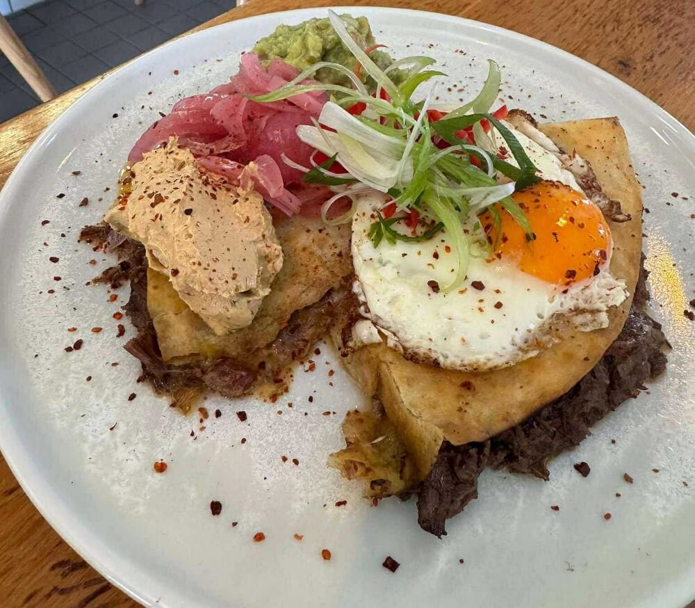 burrata cheese, fried egg, pickled red onion, guacamole and chipotle crema