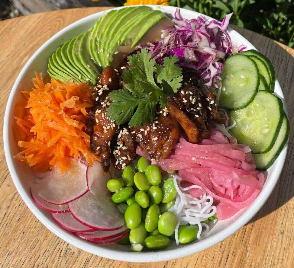 glazed chicken, rice vermicelli noodles, red cabbage, cucumber, carrot, radish, avocado, pickled red onion, sesame dressing gf, df