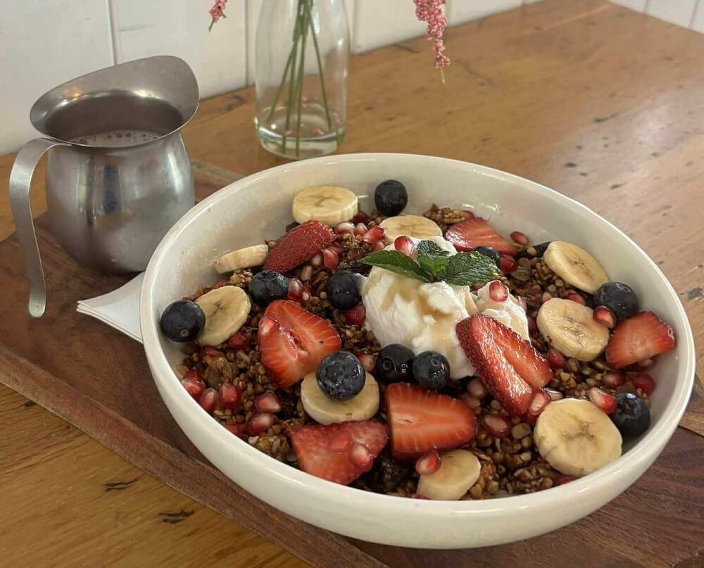 buckwheat & seed granola, coconut yoghurt, banana, fresh berries, pomegranate, maple syrup, mint gf