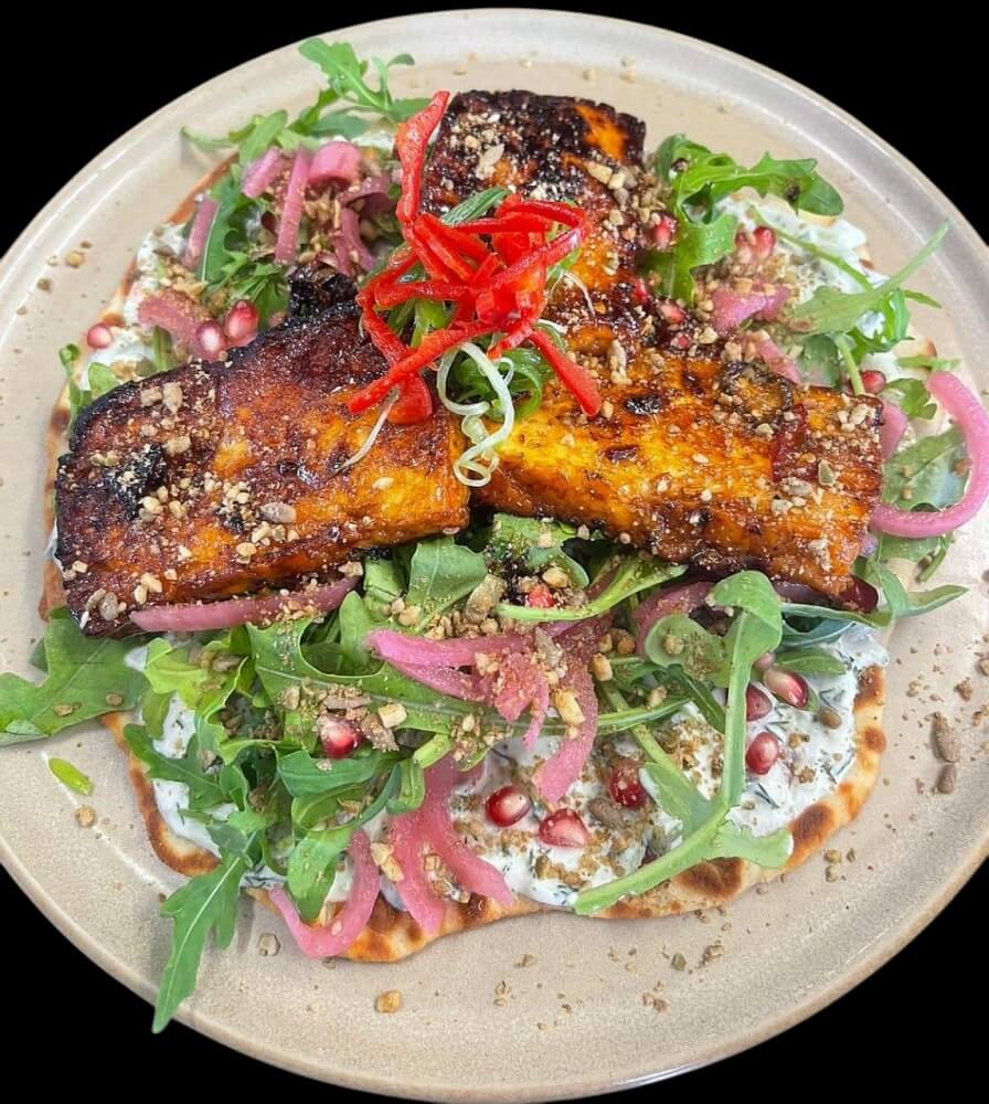 house-made flatbread with golden spiced halloumi, sliced avocado, pomegranate, pickled red onion, roquette, and tzatziki