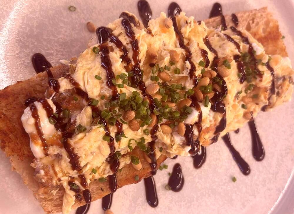 on toasted sourdough with sliced avocado, creamy miso-scramble eggs served over a kewpie mayonnaise, with furikake and crispy shallots dfo gfo
