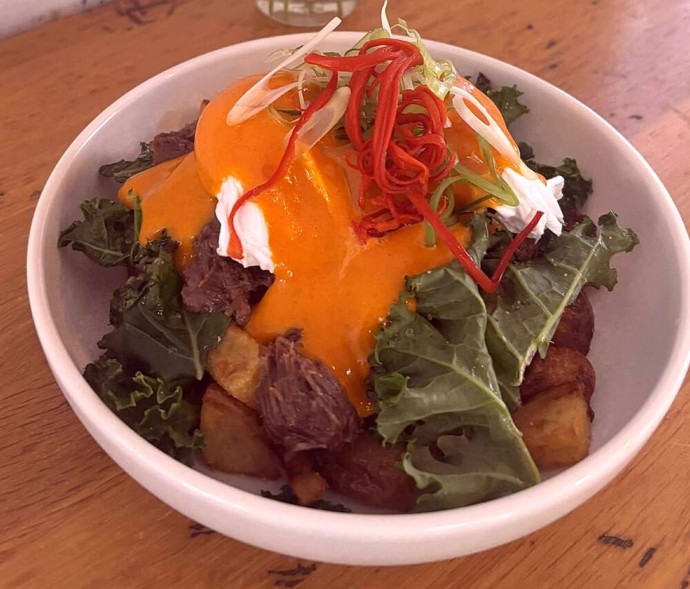 slow-cooked brisket, brushed potatoes, fried egg, kale, gochujang hollandaise gf
