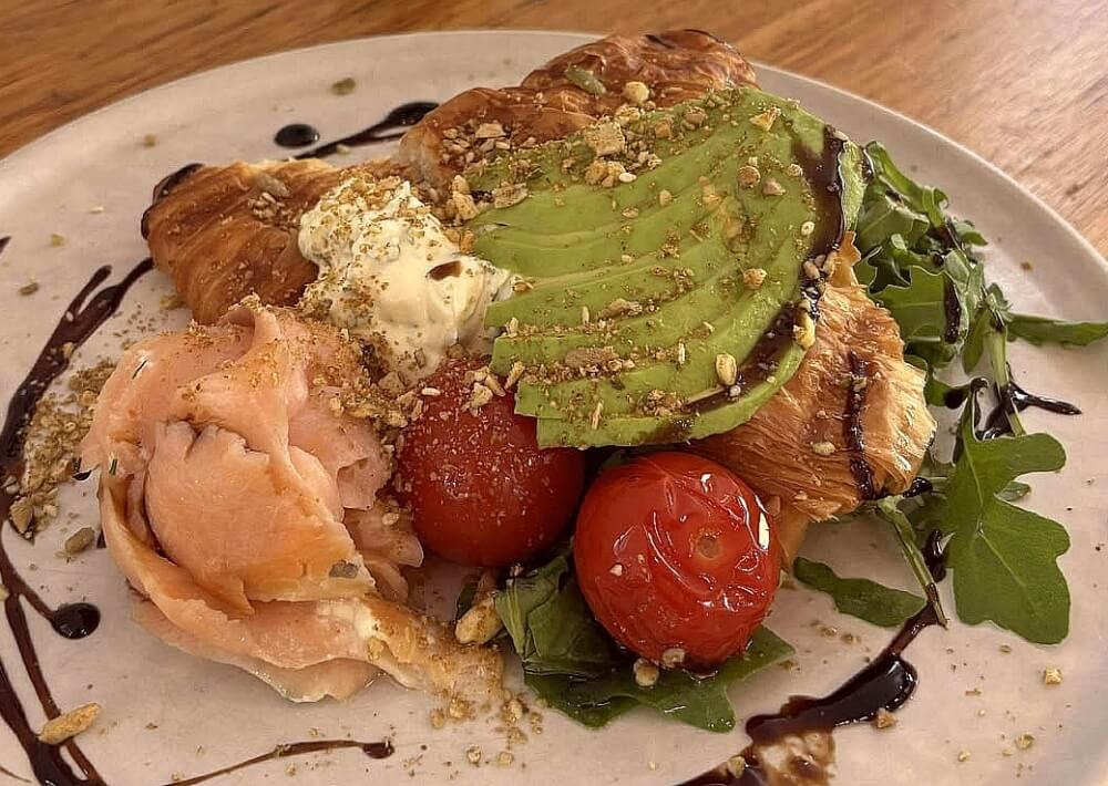 smoked salmon, herb cream cheese, confit tomato, avocado, roquette, balsamic glaze