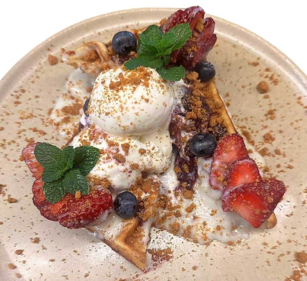 berries, vanilla ice cream, toasted biscuit crumble, coconut mousse, mixed berry compot